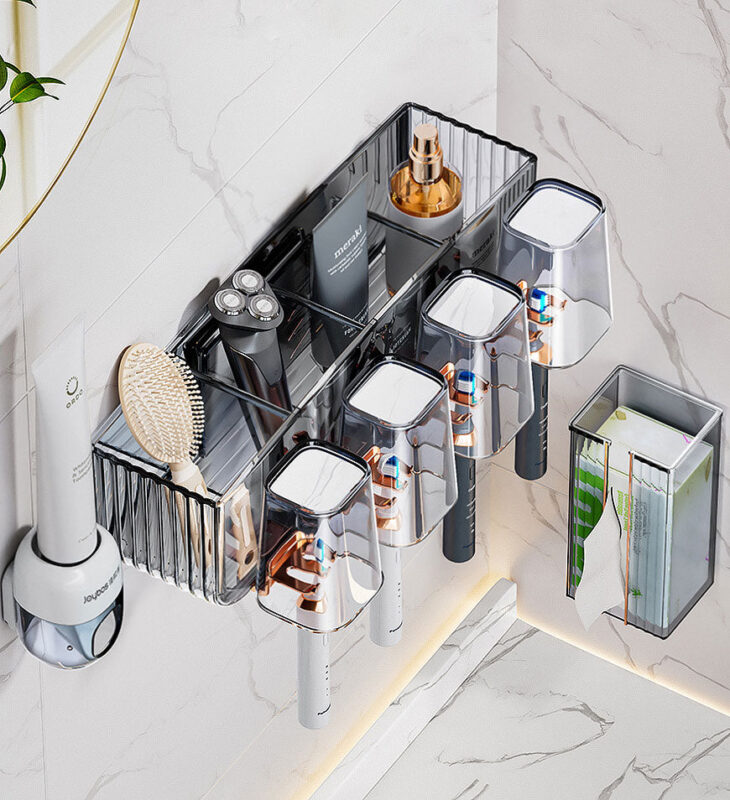 Multi-Sunctional Design: This toothbrush holder includes four mouthwash cups, four toothbrush slots, and four storage compartments. It can not only