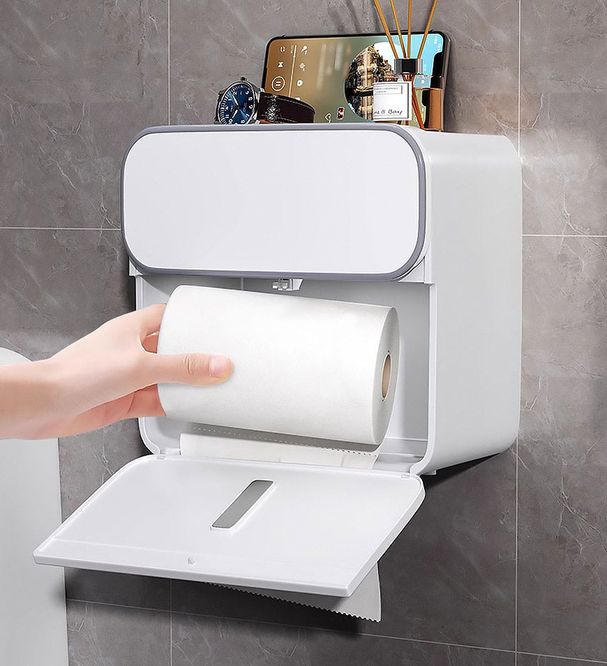 - Double tier toilet paper holder: This toilet paper holder with storage drawer can also be installed near the vanity or bathroom to hang towels, headbands, necklaces, and other small items to keep your space organized.